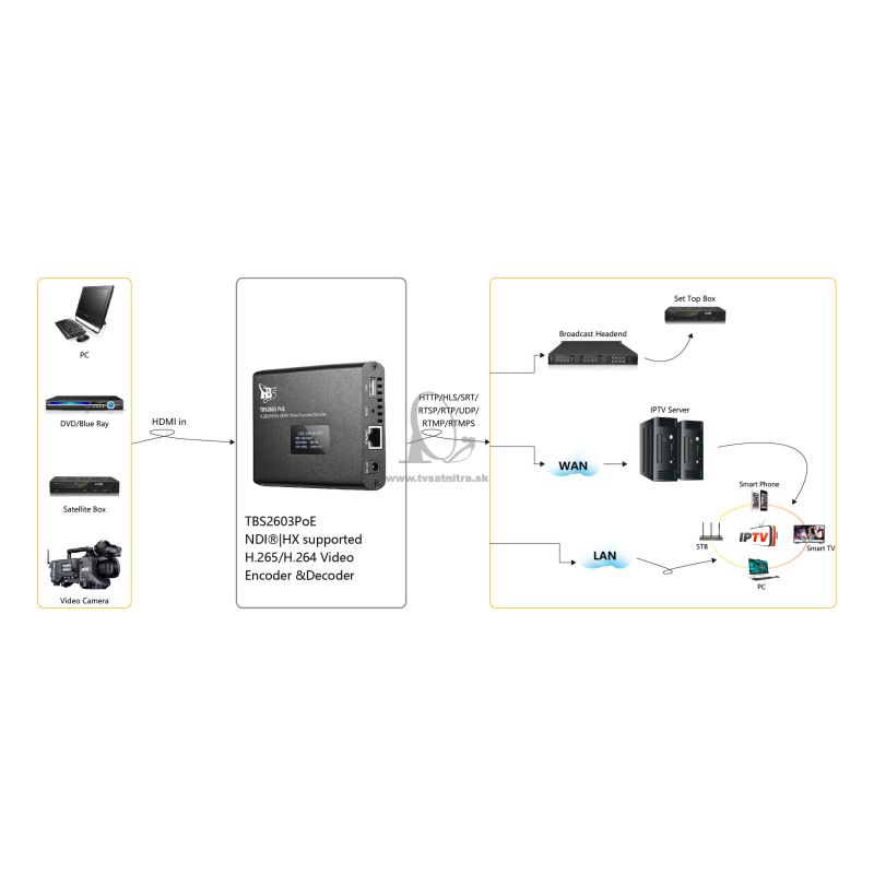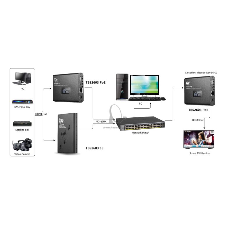 TBS-2603 PoE je profesionálny H.264/H.265 HDMI video kodér a dekodér s podporou Power over Ethernet (PoE) , je kompatibilný s NDI®|HX od NewTek a dokáže nahrávať priamo zo zdroja HDMI na USB flash disk alebo pevný disk USB .